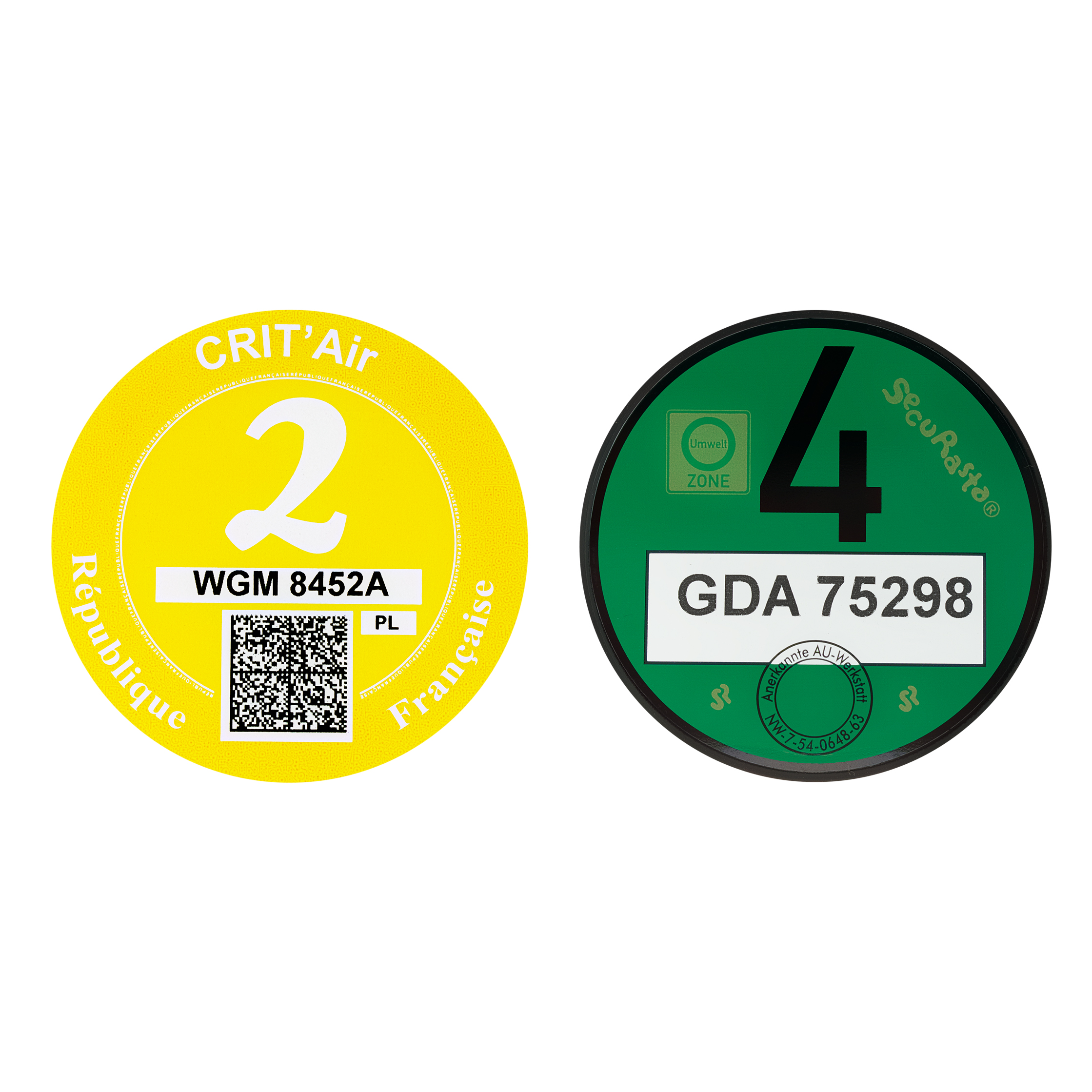 Plakietka ekologiczna Crit’Air (Francja) i Umweltplakette (Niemcy) w jednym zestawie. Obowiązkowe oznaczenia dla stref ZFE i Umweltzone.